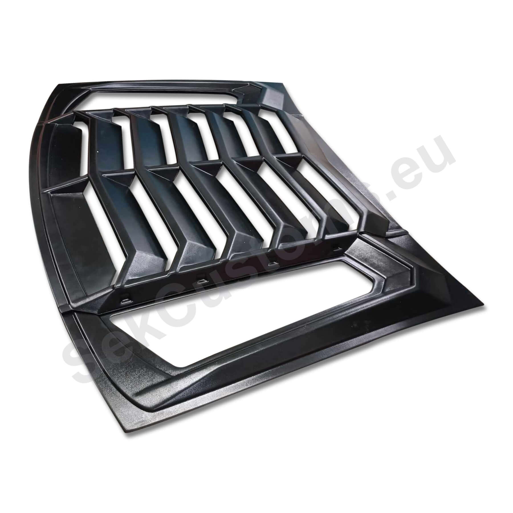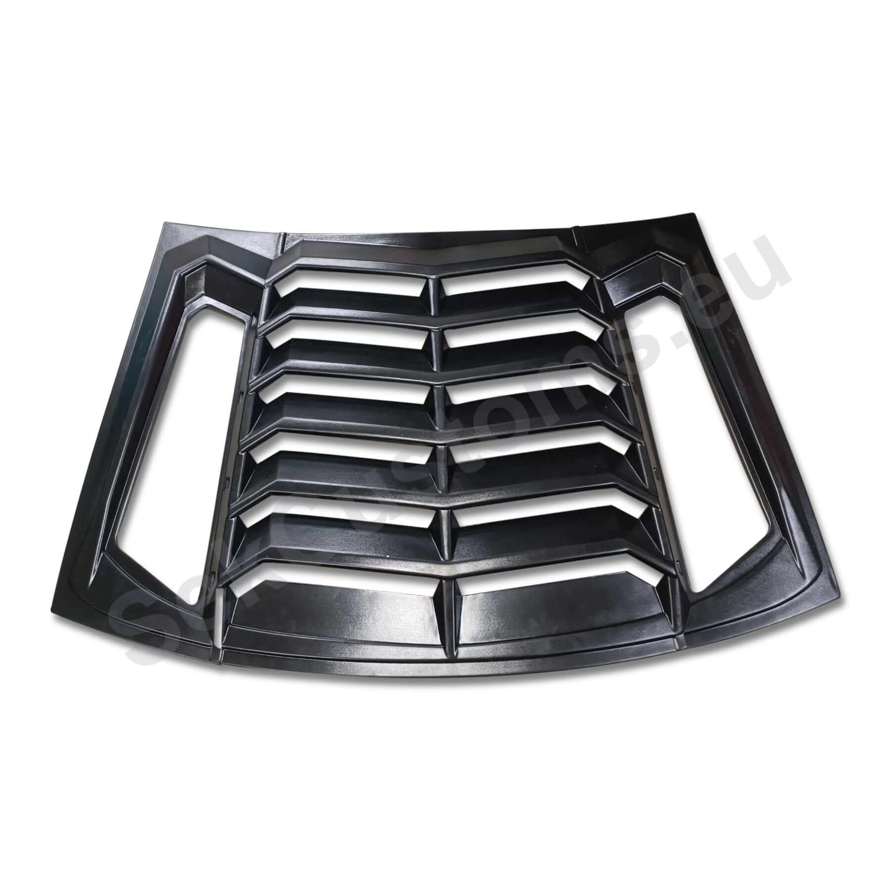 The window grille is precisely shaped to replicate the contours and dimensions of the rear window's edges. The edges of the louver align perfectly with the rubber trim of the window, providing a neat and completed finish. This rear window detail highlights and emphasizes the vehicle's lines.