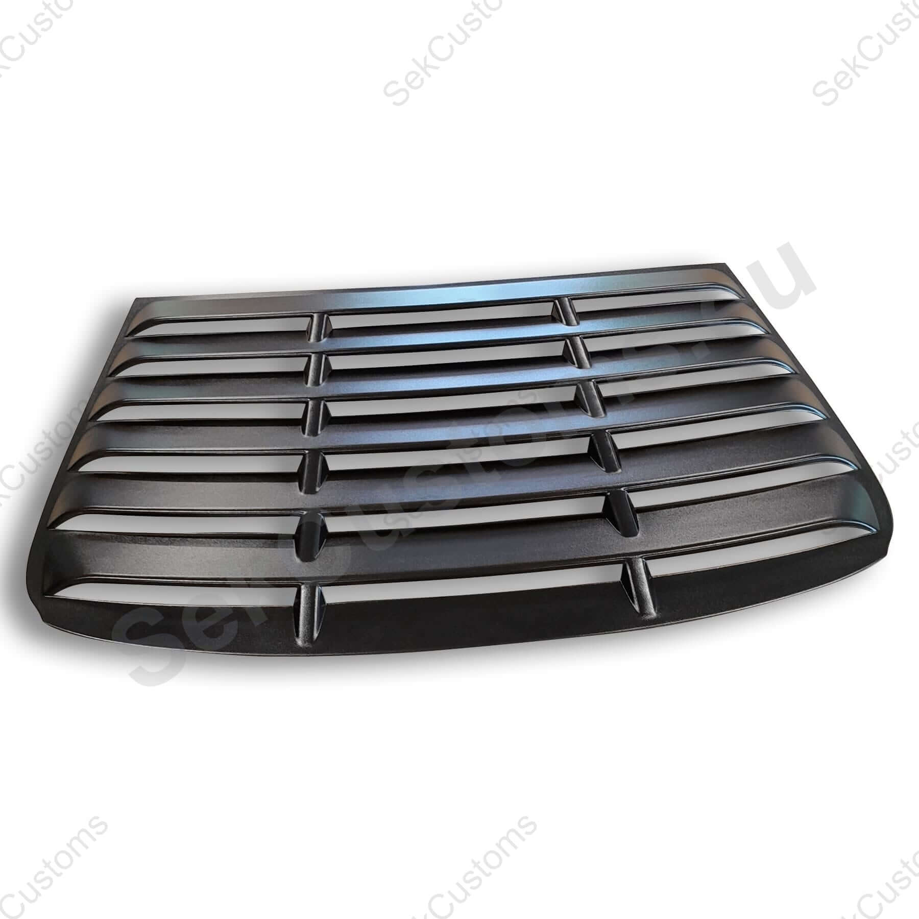 The window grille is precisely shaped to replicate the contours and dimensions of the rear window's edges. The edges of the louver align perfectly with the rubber trim of the window, providing a neat and completed finish. This rear window detail highlights and emphasizes the vehicle's lines.