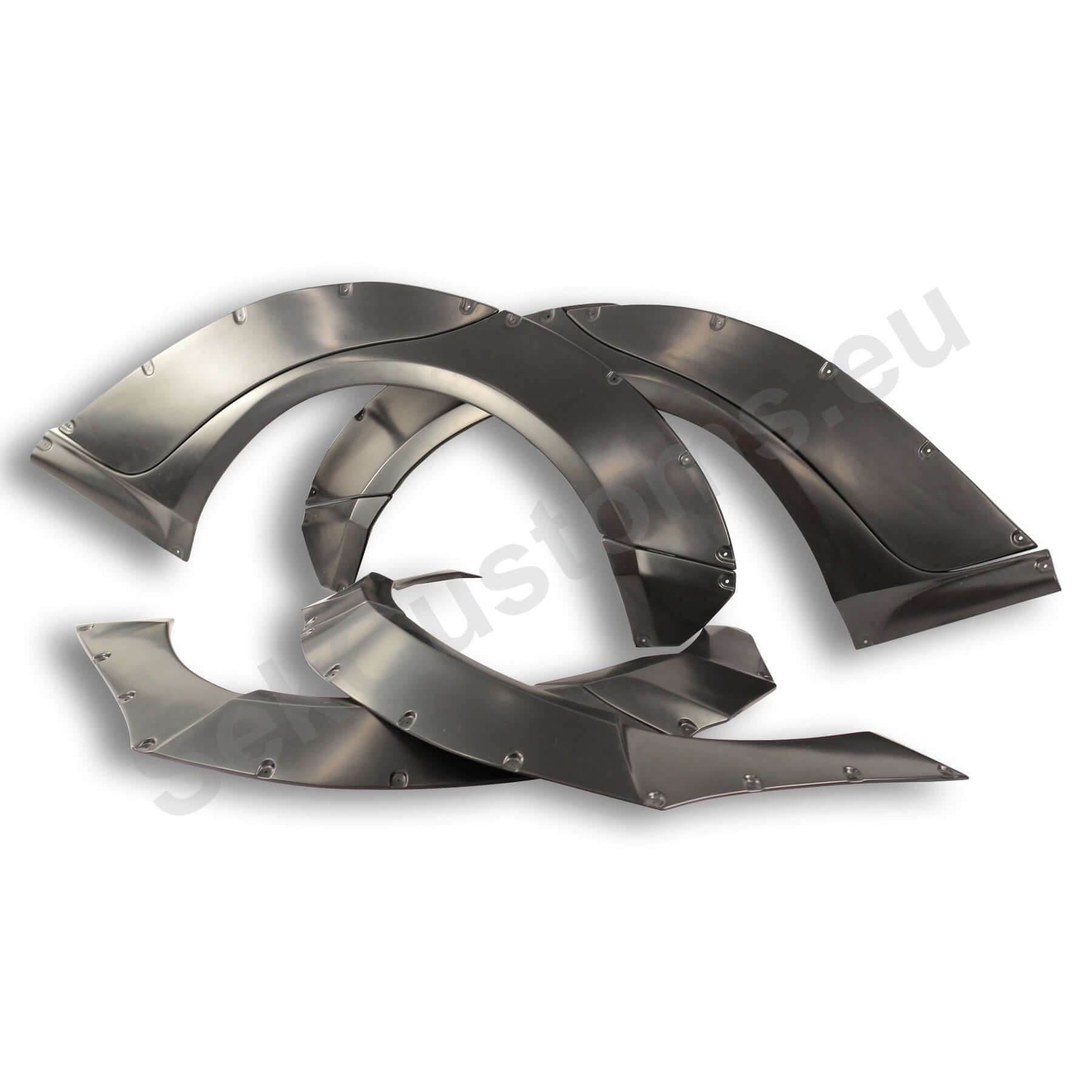 Place the car on a flat surface, preferably with your new wheels already installed. If the car will be lowered, make sure to take that into consideration as well. Align each part with the fenders and with each other, making sure it follows the body contour smoothly. To make it easier, you can temporarily stick the part with adhesive tape. Mark the spots for the holes, drill them carefully, insert rivnuts, and fasten the body with screws. If your new wheels are much wider than the factory ones and car dropped, some cutting and trimming of the original fenders might be necessary to prevent tire and fender contact.