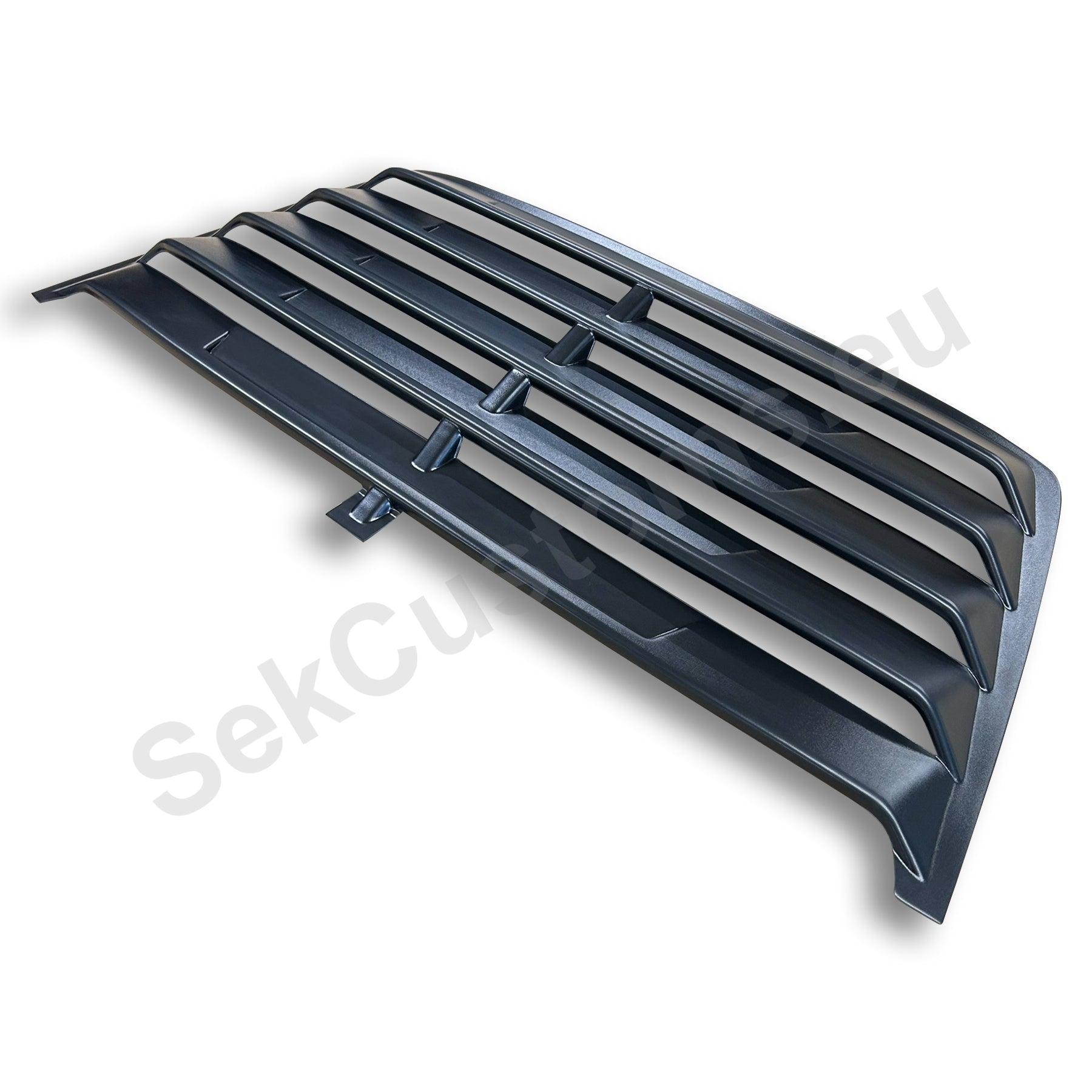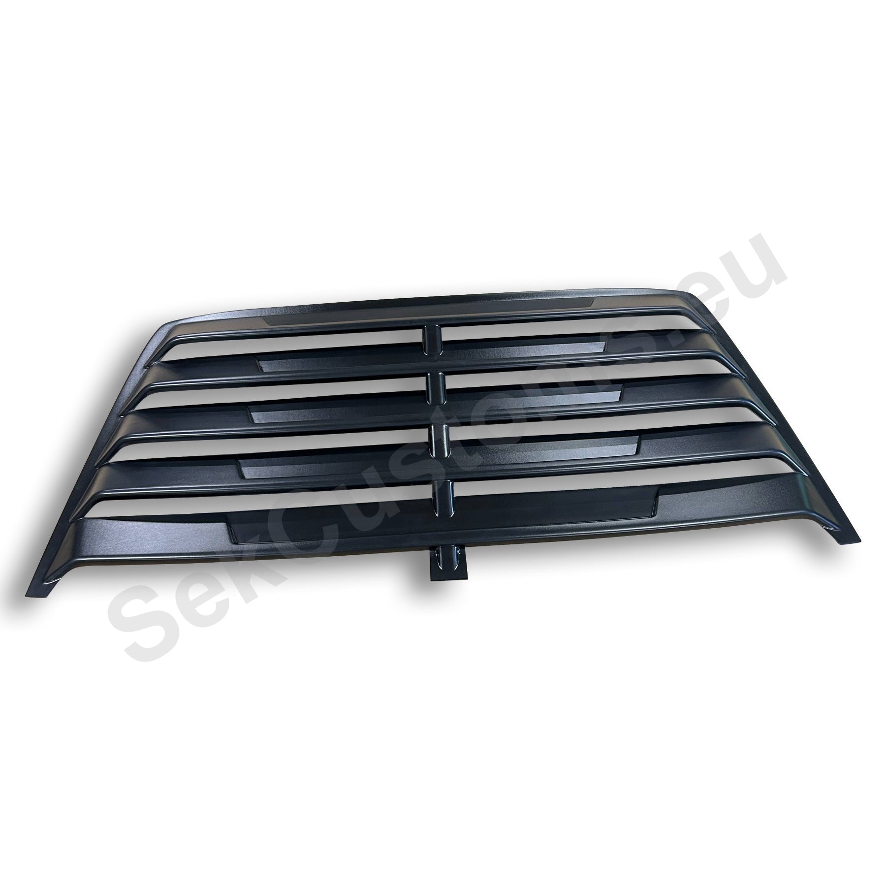 The window grille is precisely shaped to replicate the contours and dimensions of the rear window's edges. The edges of the louver align perfectly with the rubber trim of the window, providing a neat and completed finish. This rear window detail highlights and emphasizes the vehicle's lines.